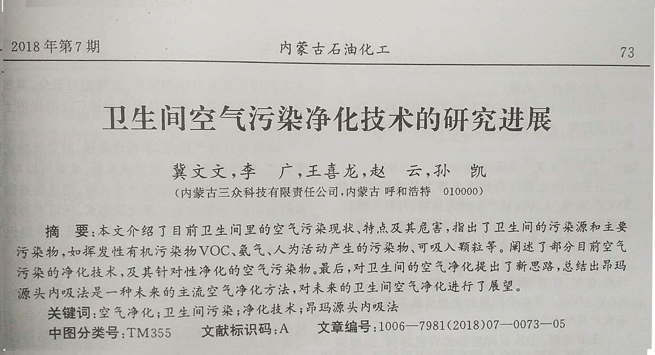 Abstract:This paper introduced something about the toilet, including its present, characteristics and harm of our pollution Meanwhile, it points out the pollution sources and main pollutants of toilet .such as volatile organic pollutants ammonia ,pollutants produced by human activities and inhalable particles. Then some current technologies for our pollution purification and the targeted decontamination of air pollutants are offered . Finally, the author put forward a new method for our purification in toilet and also makes the prospect forecast! the ONMA is a mainstream air purification method in the future, and looks forward to the future toilet air purification.