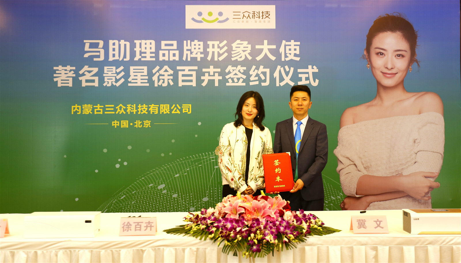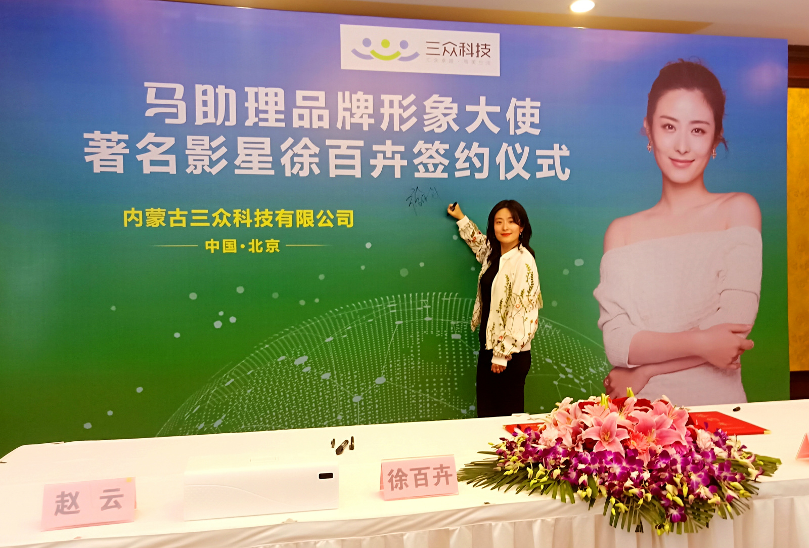 2019年4月22日,“馬助理品牌形象大使徐百卉簽約儀式”在北京鵬潤國際大酒店隆重舉行。內蒙古三眾科技有限公司聯合創始人、董事長冀文先生、聯合創始人、總經理趙云先生、聯合創始人、副總經理孫凱先生、著名影星徐百卉等嘉賓及多家媒體出席本次簽約儀式。簽約現場氣氛熱烈,本次活動取得了圓滿成功。