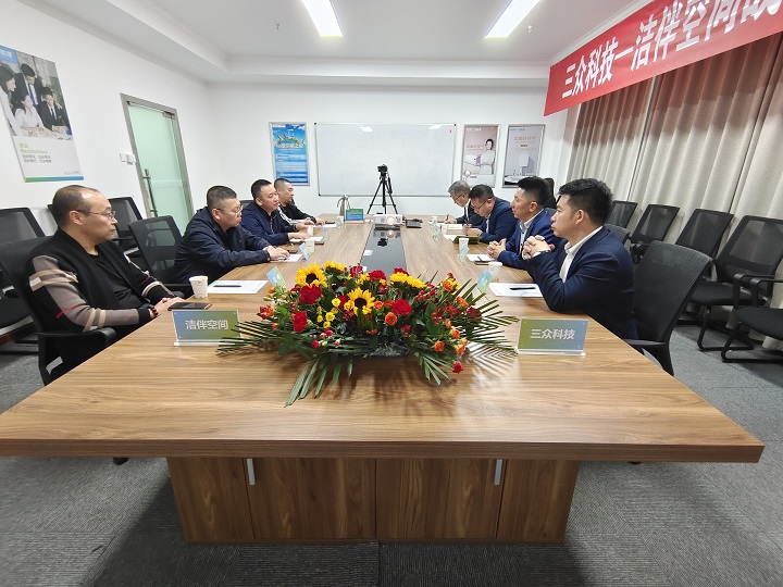 趙云主持會議并對潔伴空間一行的到訪表示熱烈歡迎。雙方經過前期的合作交流,達成一致意向,決定正式啟動“三眾科技-潔伴空間戰略合作”。