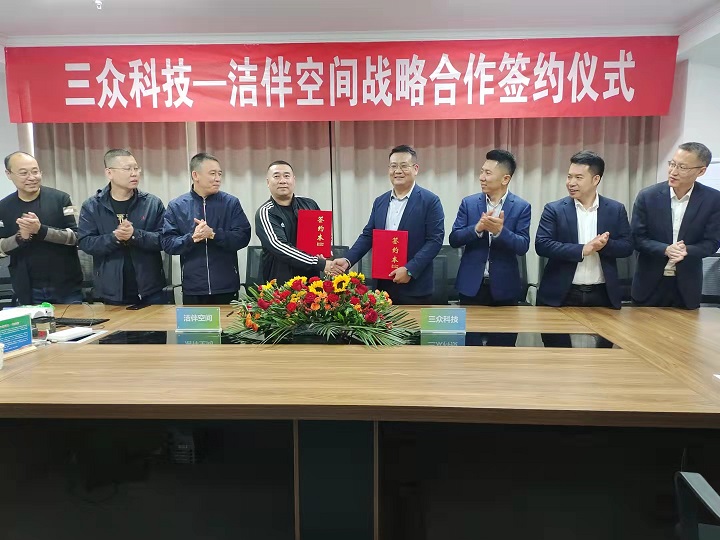 隨后,趙云和侯慶山分別代表三眾科技和潔伴空間簽署戰略合作框架協議,并合影留念,三眾科技于潔伴空間正式達成戰略合作!